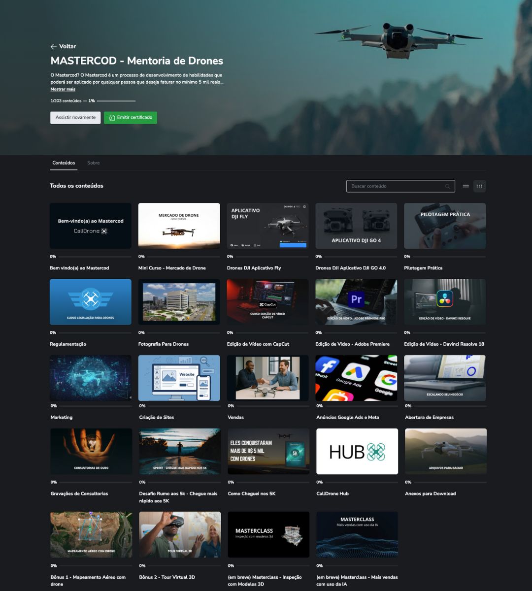 Os bônus de Mapeamento Aéreo e Tour Virtual são decisivos para quem quer ultrapassar a barreira dos 10 mil reais de faturamento. São serviços de alta demanda e ticket mais alto, que ampliam seu portfólio, aumentam suas oportunidades e colocam você em um nível acima da maioria dos pilotos do mercado.